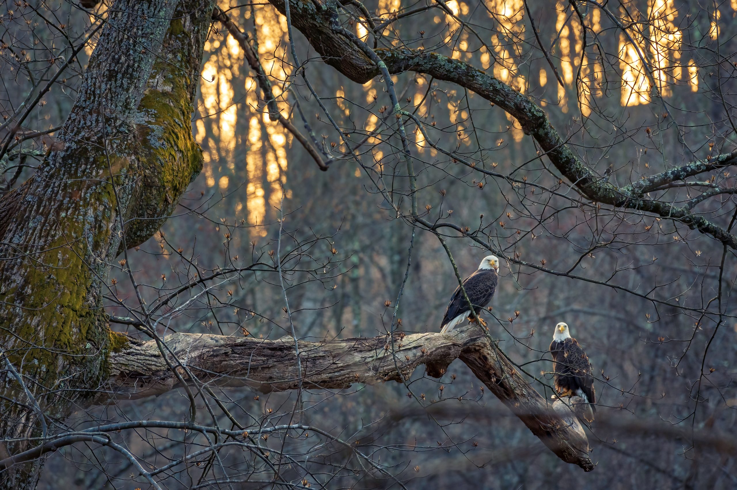 A male and female Bald Eagle with the setting sun. Patapsco Valley, Maryland.