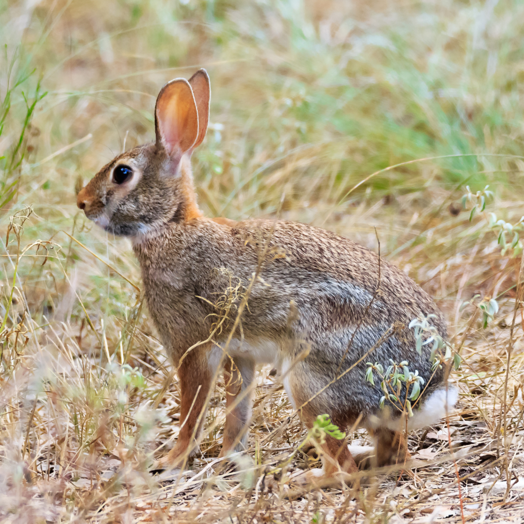 The Eastern Cottontail (Sylvilagus floridanus) is named for its small, white tail. They have speckled brown fur, long ears, and big dark eyes.